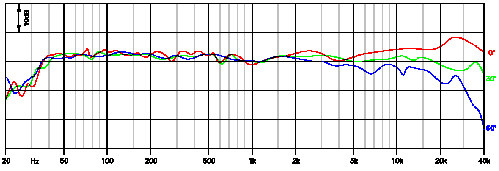 | Amplitudenfrequenzgang unter Hörraumbedingungen in 2m Abstand (Winkel 0°, 30°, 60°) |